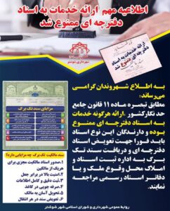 مطابق تبصره ماده ۱۱ قانون جامع حد نگارکشور ،ارائه هرگونه خدمات به اسناد دفترچه ای ممنوع بوده و دارندگان این نوع اسناد باید فورا جهت تعویض اسناد دفترچه ای و دریافت سند تک برگ به اداره ثبت اسناد و املاک محل وقوع ملک و یا دفاتر اسناد رسمی مراجعه نمایند.