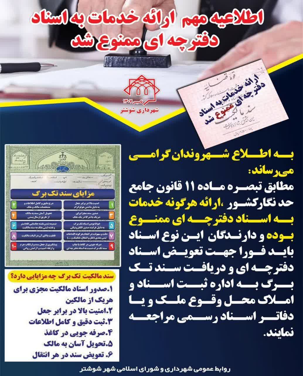 به گزارش روابط عمومی شهرداری و شورای اسلامی کهن شهر شوشتر، ارائه خدمات به اسناد دفترچه ای ممنوع شد.