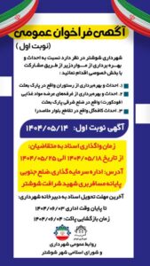 به گزارش روابط عمومی شهرداری و شورای اسلامی کهن شهر شوشتر، شهرداری شوشتر در نظر دارد نسبت به احداث و بهره برداری از موراد زیر از طریق مشارکت با بخش خصوصی اقدام نماید: