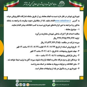 شهرداری شوشتر در نظر دارد نسبت به انجام معامله زیر از طریق سامانه تدارکات الکترونیکی دولت به آدرس www.setadiran.ir اقدام نماید. لذا از متقاضیان دعوت میگردد با مراجعه به سامانه مذکور و یا مراجعه به امور قراردادهای شهرداری نسبت به کسب اطلاعات بیشتر اقدام نمایند.
