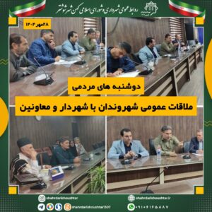 در این دیدار مردمی، جمعی از شهروندان ضمن طرح مسائل، مشکلات و درخواستهای خود در حوزههای مختلف خدمات شهری، عمرانی، فنی و اجتماعی، پاسخها و راهنماییهای لازم را از شهردار و معاونین مربوطه دریافت کردند.