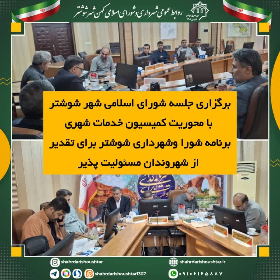 به گزارش روابط عمومی شهرداری و شورای اسلامی شهر شوشتر، جلسه شورای اسلامی شهر شوشتر با محوریت بررسی مسائل حوزه خدمات شهری، در روز یک شنبه۱۳مهرماه ۱۴۰۴ با حضوراعضای شورا و شهردار شوشتر در سالن جلسات شورای شهر برگزار شد.